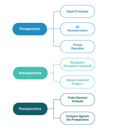 Digital orthopedics helps orthopedists to manage the entire surgical procedure. The entire procedure includes preoperative decisions, intraoperative guidance, and postoperative management. Technologies in digital orthopedics include virtual operation planning, computer-assisted navigation in operations, rapid prototype-assisted operations, virtual operations training, and etc. The application of digital orthopedics in clinical practice is shown in Figure 1. (Pei, 2014)